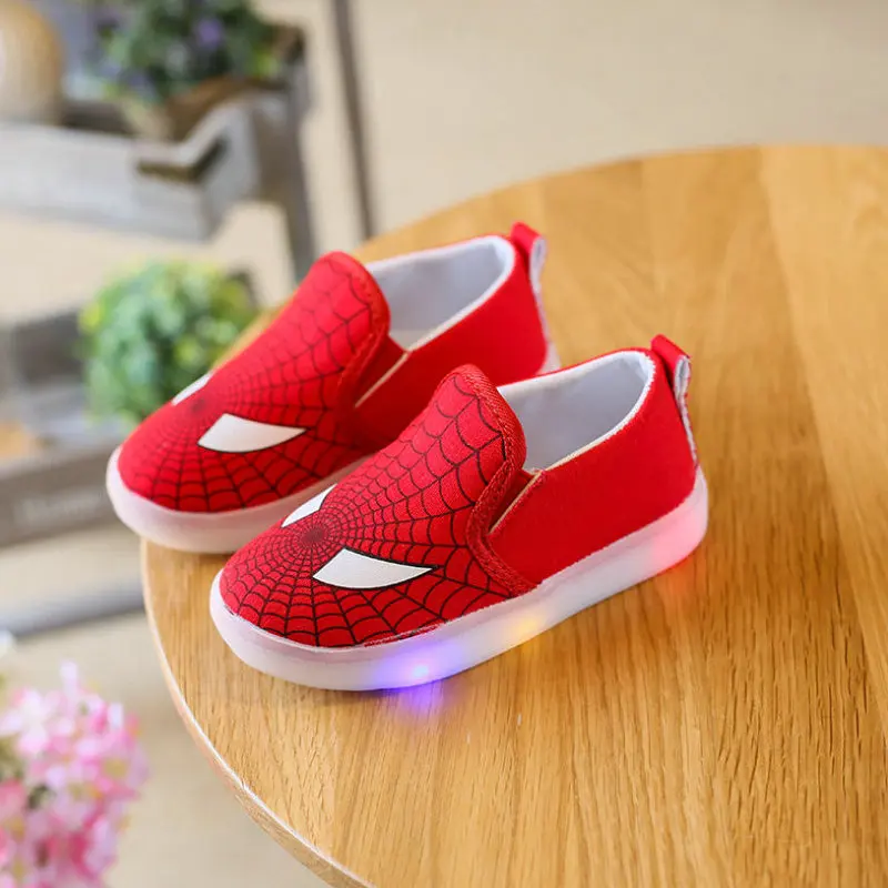 معرض من الأطفال LED أحذية 2018 جديد طفل تصميم المطبوعة الكرتون أحذية الاطفال أحذية رياضية كاجوال وامض سبايدرمان الفتيان حذاء رياضة مع ضوء